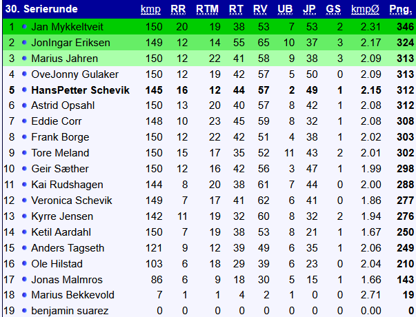 Like bak følger JonIngar Eriksen med 324 poeng og Marius Jahren og OveJonny Gulaker som begge har 313 poeng. Det er en utrolig jevn kamp om topplasseringene, og med så mange poeng til rådighet i hver runde, kan alt skje før finalen i sesongen.