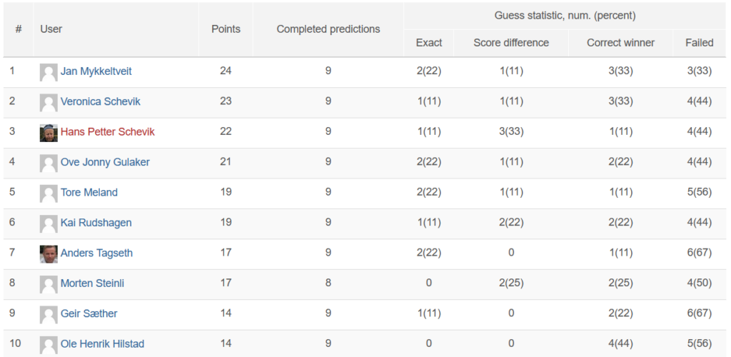 Jan Mykkeltveit kunne juble etter den nylig avsluttede helgen, etter at han sikret seg rundeseier i runde 29 (ja, det mangler en kamp). Han endte opp med 24 poeng, og kun poenget bak havnet Veronica Schevik. Som vanlig kom gubben halsende rett bak, hvor Hans Petter Schevik endte med 23.