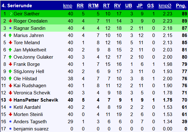 Det er imidlertid et getingbol i toppen av tabellen. Like bak tet-duoen jager Ragnar Sandin med 87 poeng, mens rundens toer, Marius Jahren, har klatret opp på en sterk fjerdeplass med 86 poeng. Tore Meland kompletterer topp fem med 85 poeng. Med kun fire poeng som skiller de fem øverste, er kampen om tittelen vidåpen.