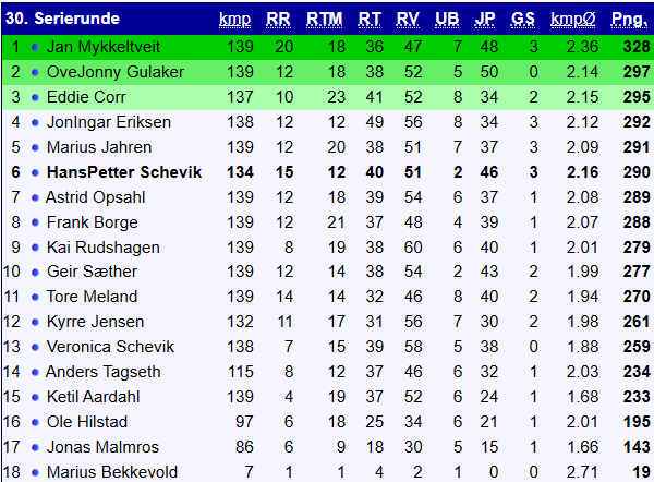 Bak Mykkeltveit og Gulaker er det jevnt, med Eddie Corr på tredjeplass med 295 poeng, like foran JonIngar Eriksen (292) og Marius Jahren (291). Hele åtte tippere ligger i et tett felt på under 40 poeng. Med 13 runder igjen er det fortsatt fullt mulig å klatre på listen, og kampen om de øverste plassene er langt fra over.