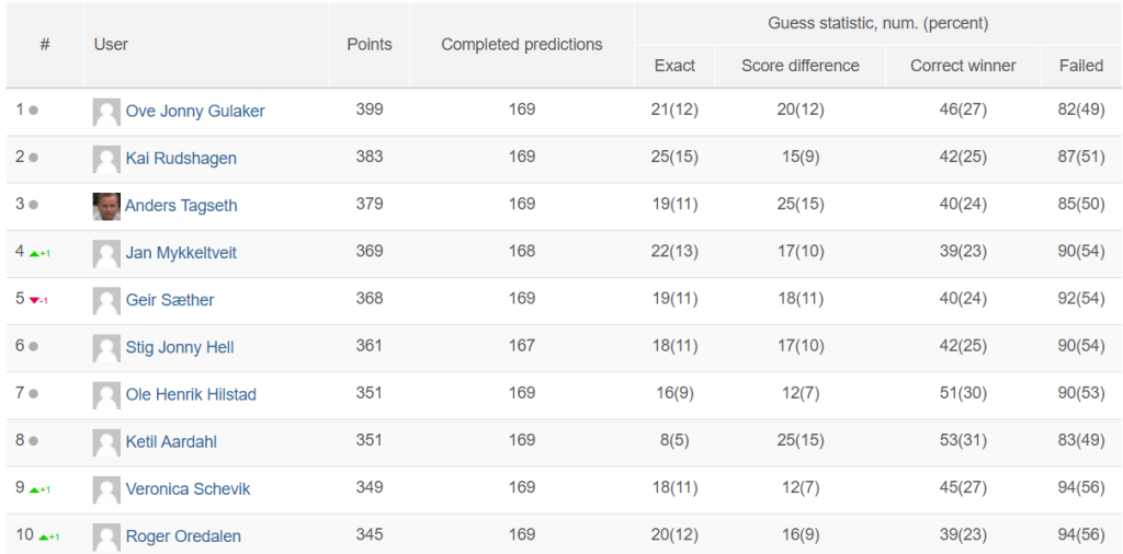 Solid juleledelse Premier League 23/12/202423/12/2024 Ove Gulaker kan meske seg med ribba som leder i Premier League, og har nå en luke på 16 poeng ned til Kai Rudshagen på topp. Anders Tagseth innehar 3. plassen, mens Jan Mykkeltveit igjen har karret seg opp på den siste premieplassen. FacebookFacebookXXLINELine