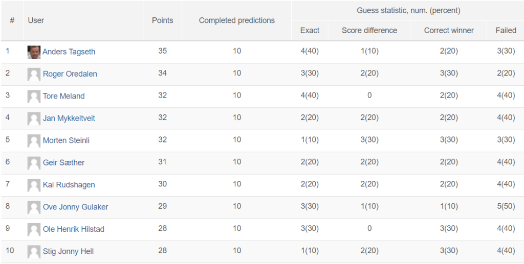 Så er endelig resultatene lagt inn fra helgens runde (beklager forsinkelsen). Anders Tagseth sikret seg Premier Leagues første rundeseier, med 35 poeng i åpningsrunden. Roger Oredalen havnet poenget bak på 2. plass, mens Tore Meland sikret 3. plassen på skilleregler mot Jan Mykkeltveit og Morten Steinli.