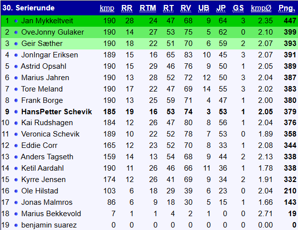 Kampen om de øvrige pallplassene er imidlertid vidåpen. Gulaker (399 poeng) har kun en liten luke ned til Geir Sæther (393 poeng) og JonIngar Eriksen (391 poeng). Også Astrid Opsahl (389 poeng), Marius Jahren (387 poeng) og Tore Meland (383 poeng) er med i kampen om en topplassering, noe som lover en nervepirrende avslutning på sesongen.