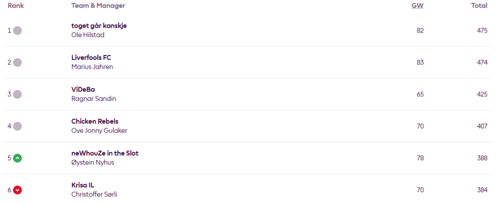 Med kun ett poeng som skiller første- og andreplassen, ligger alt til rette for en nervepirrende fortsettelse. Hilstads evne til å kombinere jevn poengsanking med høye topper har vist seg å være en vinneroppskrift så langt. Samtidig beviser Jahren at han har et skyhøyt potensial med rundens beste score. Nå blir det spennende å se hvem som tar de riktige valgene og treffer på kapteinsvalget i den kommende runden.
