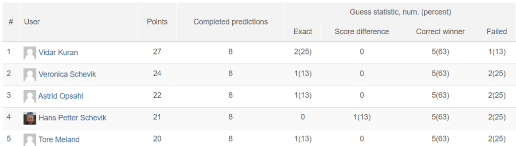 Runde 8 i Verdenscupen ble en hyggelig helg for Vidar Kuran. Han smelte til med 27 poeng, og ble dermed rundevinner. Veronica Schevik sikret 2. plassen tre poeng bak, mens sammenlagtleder Astrid Opsahl tok siste pallplass.