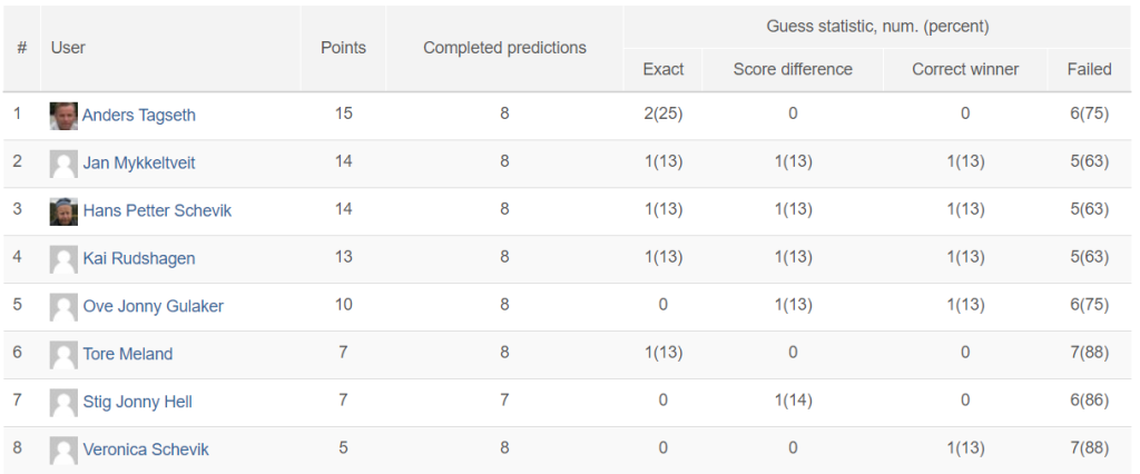 Vrien runde Eliteserien 09/10/202309/10/2023 Runde 24 i Eliteserien ble ikke noen enorm poengfangst for noen. Anders Tagseth ble rundevinner med sine 15 poeng, mens duoen Jan Mykkeltveit og Hans Petter Schevik fulgte etter med sine 14. FacebookFacebookXXLINELine